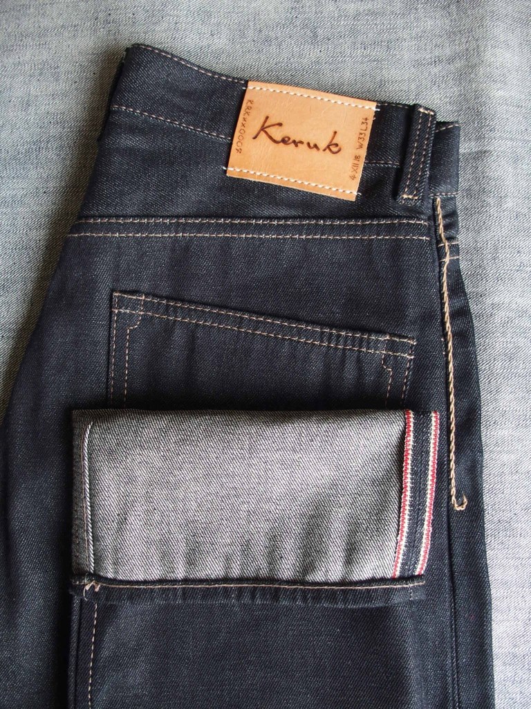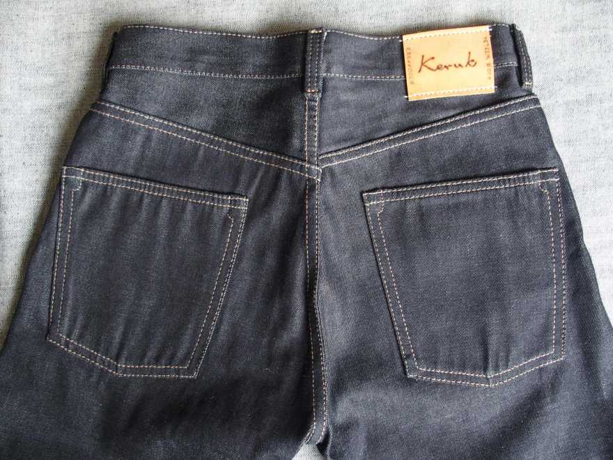 デニムの作りとデザインはKeruk Jeans オリジナル:5つのポケット、バックに隠しリベット、アシンメトリーなセンターバックシーム。内側は、クリーンな仕上がりとなるよう、インシーム(縫い目)を折り込み、縁が見えることのないようにしている。