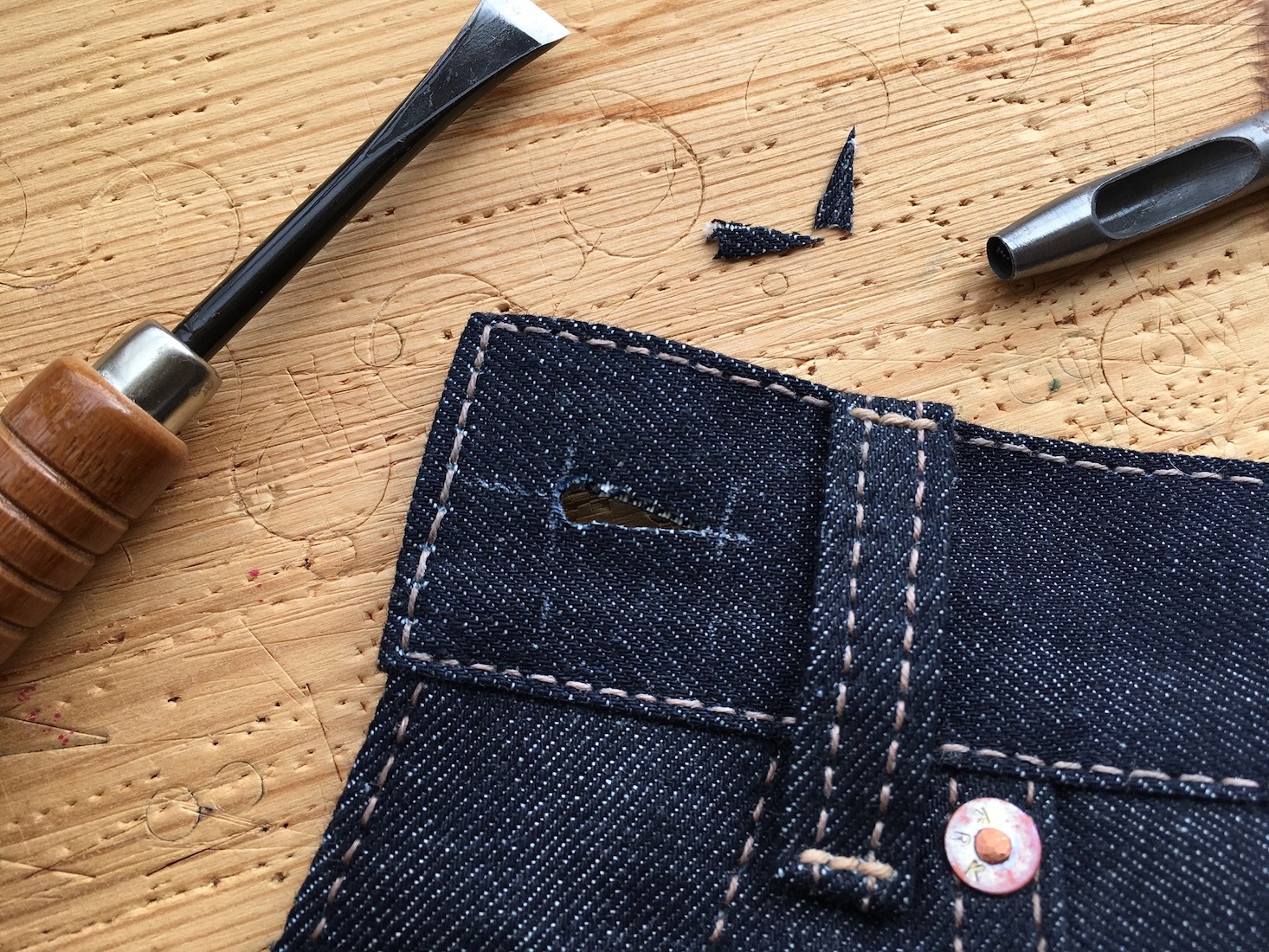 Hand sewn buttonholes are small pieces of embroidery. Only found on high quality garments such as bespoke suits, a handmade buttonhole is also a sign, a seal of craftsmanship. On a Keruk Jeans, the buttonholes are made using the same linen thread of the main stitches. Emerging from dark blue denim, the contrasting color of the buttonholes’ thread shows their precision and uniqueness.