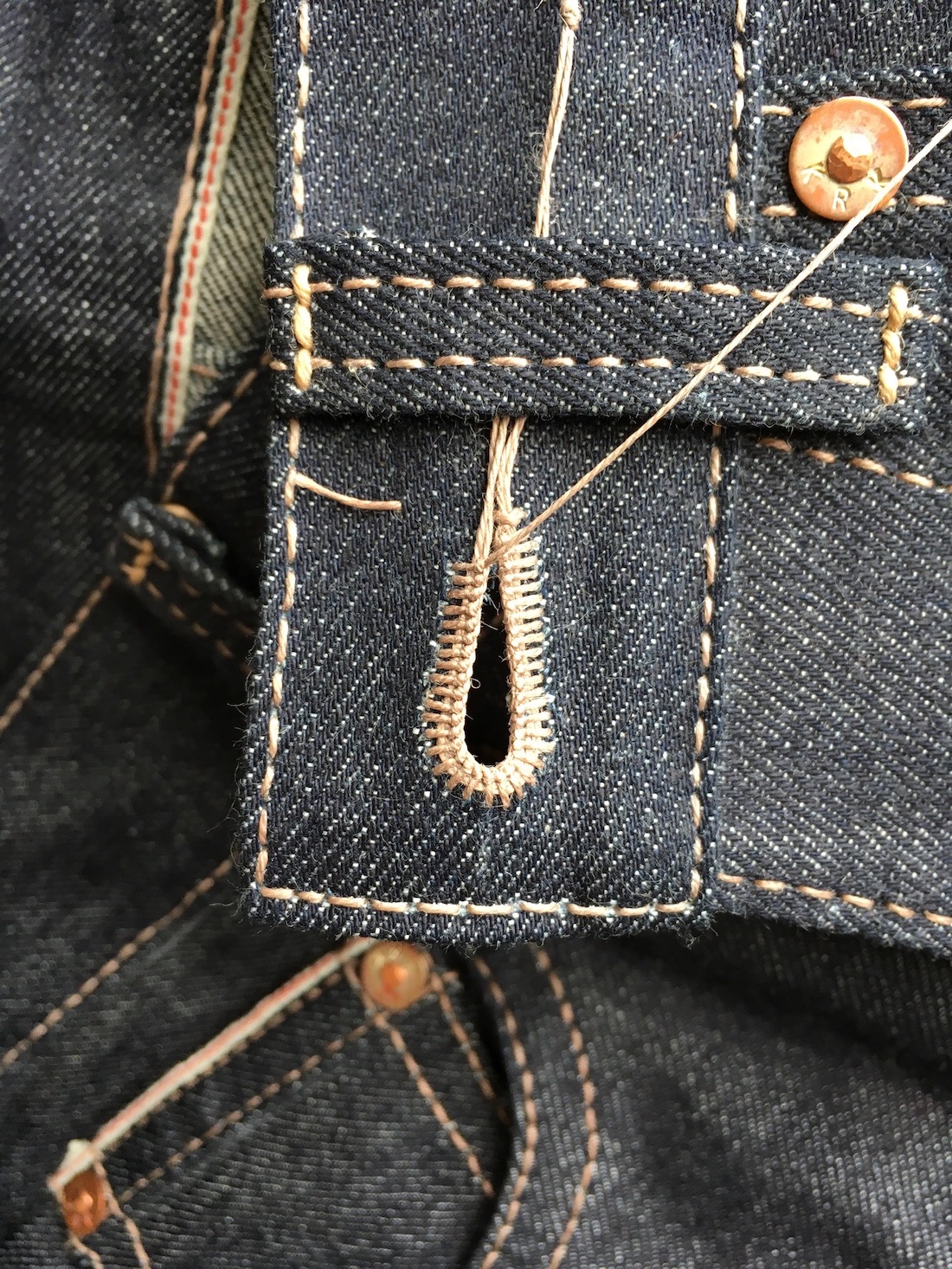 手縫いによるボタンホール、それは極小の刺繍作品と言える。ビスポークスーツなどのハイクオリティー衣料で用いられ、ハンドメイドのボタンホールはブランドのシグニチャーであり、クラフトマンシップの証でもある。Keruk Jeans では、メインステッチと同じ麻糸をボタンホールに使用。ボタンホールが生み出すダークブルーデニムとのカラーコントラストは、Keruk Jeans の精巧さとオリジナリティを体現している。